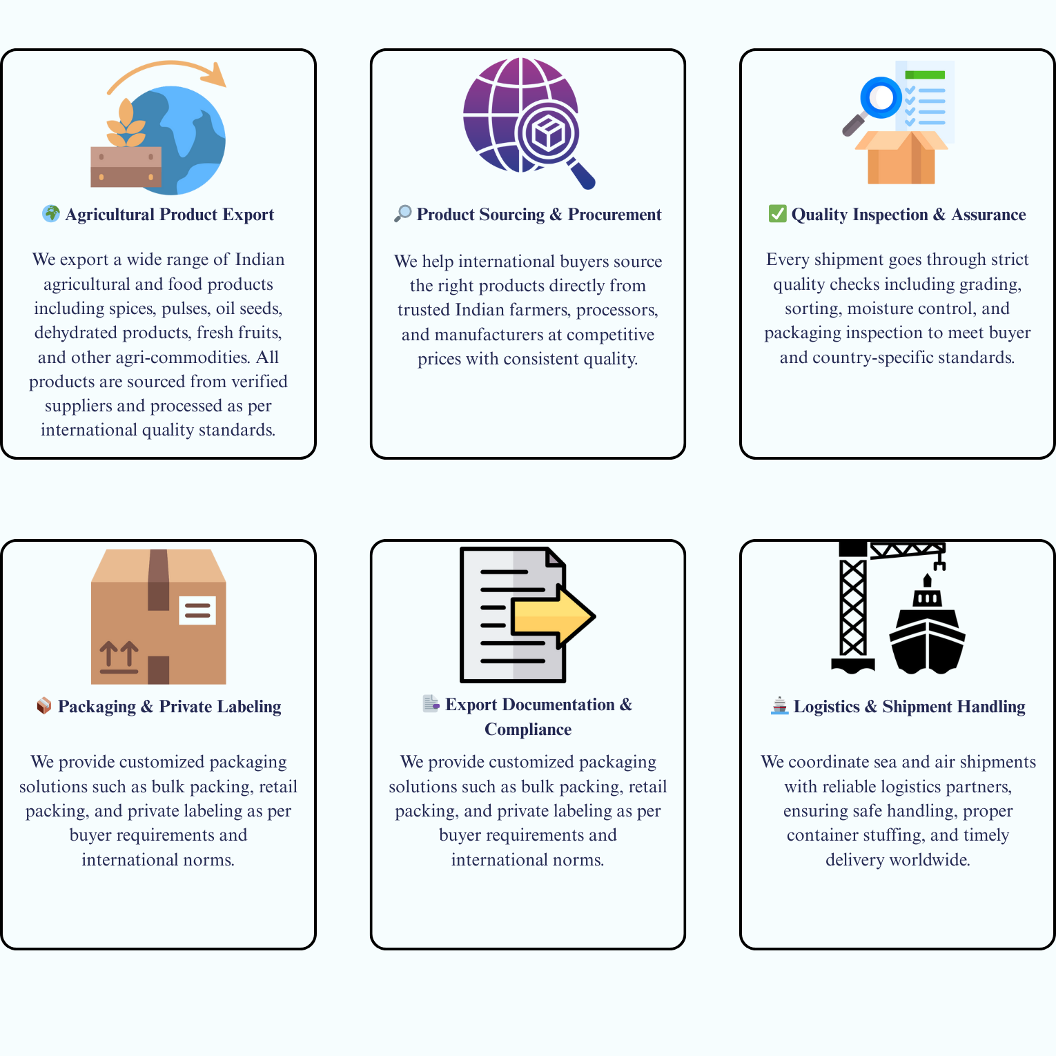 Trusted Export Partners Connecting global markets with premium agricultural products sourced directly from dedicated farmers. Our Services Global Export Markets We Serve from India